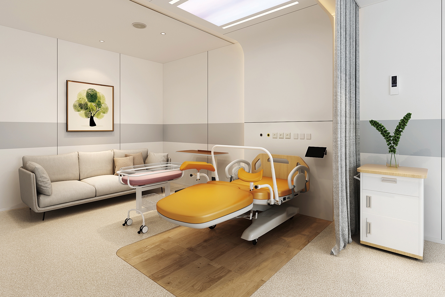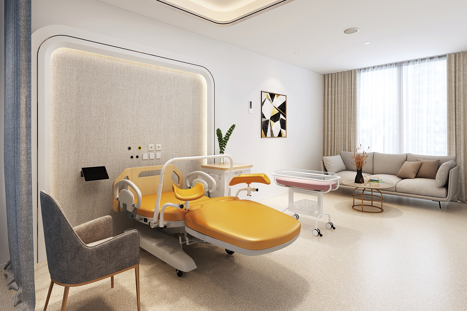 潔凈的地面搭配簡約的裝飾,產婦進入其中感受到家的溫馨,能夠從心里上滿足產婦對醫院的需求。注重生活品位、注重健康時尚,也注重合理節約,這里不是醫療環境,而更像是一個安靜、舒適、充滿愛意的家,讓產婦完全享受其中,幸福地迎接寶寶的到來。簡約設計風格,沒有過多裝飾,一切從功能出發,講究造型比例適度、空間結構明確美觀,外觀的明快、簡潔。室內所有醫療設備均可輕松移動,方便醫護人員取用。