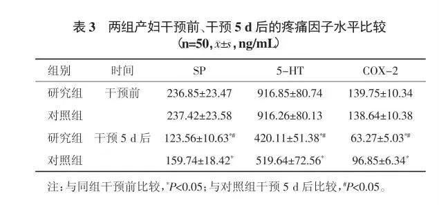 雖然無痛分(fen)娩技(ji)術在一定程度上減輕了產婦(fu)的(de)疼痛,但(dan)是產婦(fu)仍然會感受到分(fen)娩的(de)痛苦(ku)。SP、5-HT以及 COX-2是臨床衡量疼痛程度的(de)常(chang)用客觀(guan)因子,正(zheng)常(chang)情況下疼痛因子水(shui)平較低,當機體受到傷害、感受到痛感后(hou),其(qi)水(shui)平會異(yi)常(chang)升高(gao)。本研(yan)究結果顯示,干預(yu)5d后(hou),研(yan)究組的(de)SP、5-HT及COX-2 水(shui)平低于對照(zhao)組,差異(yi)具有統計學意(yi)義 (P<0.05)。