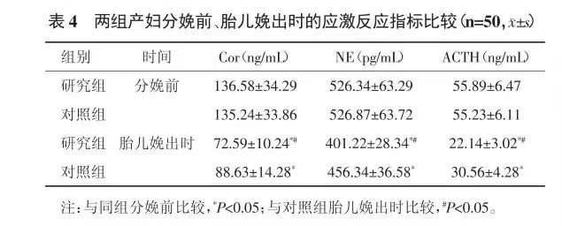 2.4 兩組產婦分娩前、胎兒娩出時的應激反應指標比較